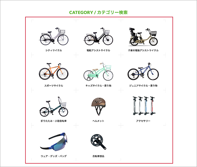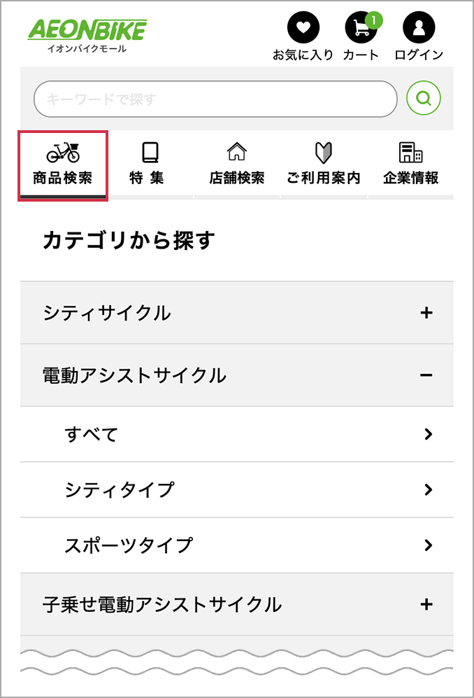 ページ上部の「商品検索」ボタンや、TOPページの「カテゴリー検索」から、カテゴリーを絞りこんで、商品を検索することもできます。