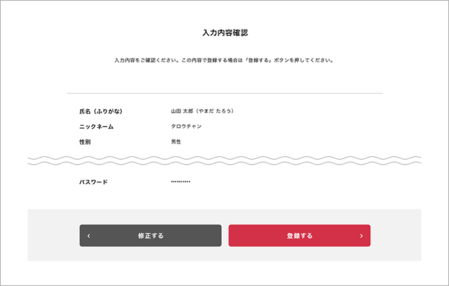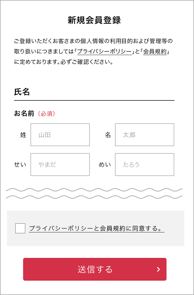 1.新規会員登録画面から、氏名や住所など注文者情報を入力し、「送信する」ボタンを押してください。