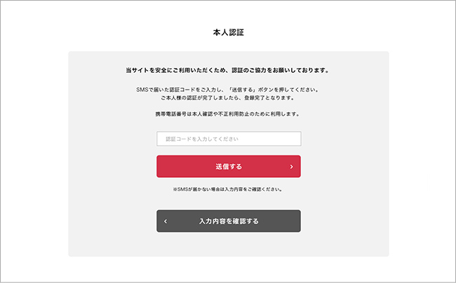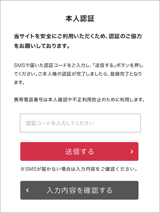 3.送られてきた認証コードをこちらに入力し、「送信する」ボタンを押してください。認証コードが届かない場合は「入力内容を確認する」より、携帯電話番号をご確認ください。