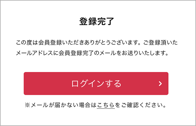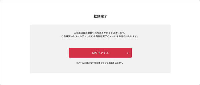4.ご本人様の認証が完了しましたら、登録完了となります。「ログインする」ボタンより、ログインし、お買い物を始めてください。