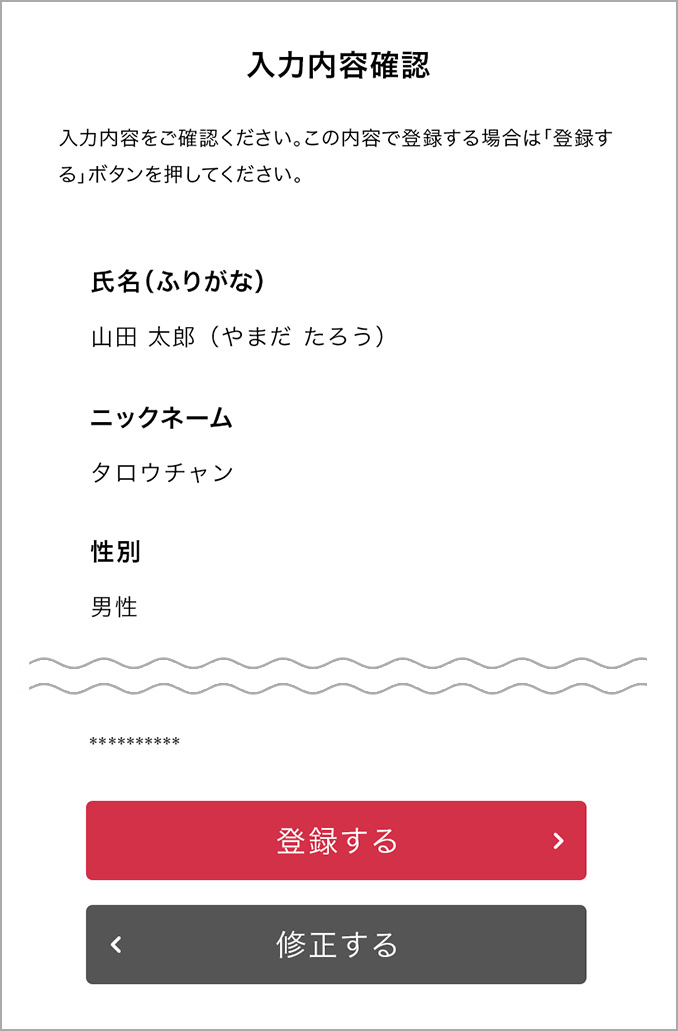 2.入力した情報にお間違いがないかご確認いただき、「登録する」ボタンを押してください。登録の電話番号に「認証コード」をSMSで送信します。